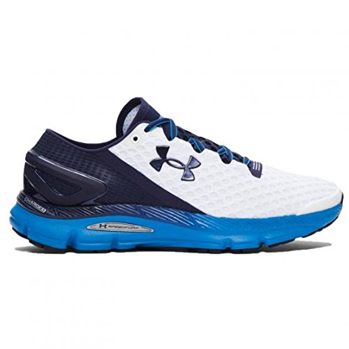 A smooth precision fit for unbelievable comfort, Under Armour's Speedform Gemini 2 Running Shoes in White and Midnight Navy Blue keep you focused on your goals.Having more in common with a slipper than an actual performance trainer, the one-piece upper of this UA Trainer effortlessly slips on, and with ultrasonic welded seaming, a natural feel is assured. There's also perforated material wrapped over the toes and down the sides for added breathability to keep you cool over any distance.The midsole and the Charged Foam material of these Under Armour running trainers are both cushioned and responsive for enhanced performance while the TPU curve in the midfoot brings welcome extra support and stability. When it comes to the sole, the UA Speedform Gemini still excels as the carbon rubber heel keeps the weight off but brings extra durability. Anatomically placed flex grooves also allow an optimal heel-to-toe transition for a smoother ride over firm surfaces.Ideal for all performance levels and skills, from new runners all the way to professionals, run with confidence in a pair of Under Armour Speedform Gemini 2 Running Shoes that'll lead you sprinting towards success.This running shoe weighs 292g (UK size 8).